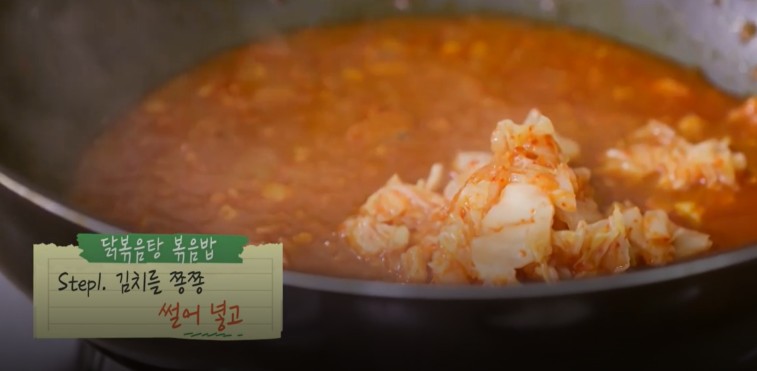1. 남은 닭볶음탕 국물에 김치를 송송 썰어서 넣고 참기름도 한 바퀴 둘러줍니다.